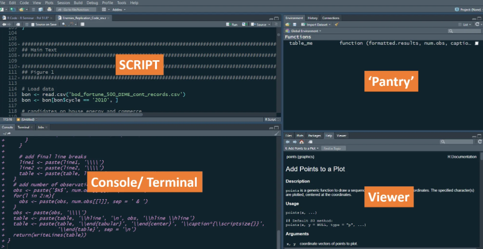 Once you open up R Studio, you should see 4 window panes. On the left top quadrant, you will see your script (where you will type in your code). On the bottom left is the console/terminal (where R will show you what it’s doing). On the right top, the first tab shows the environment, or what I like to call “pantry”, where you see your objects and datasets saved. Below is the viewer, where you have tabs like “Files”, “Plots”, or “Viewer”, which shows the graphs and other outputs.