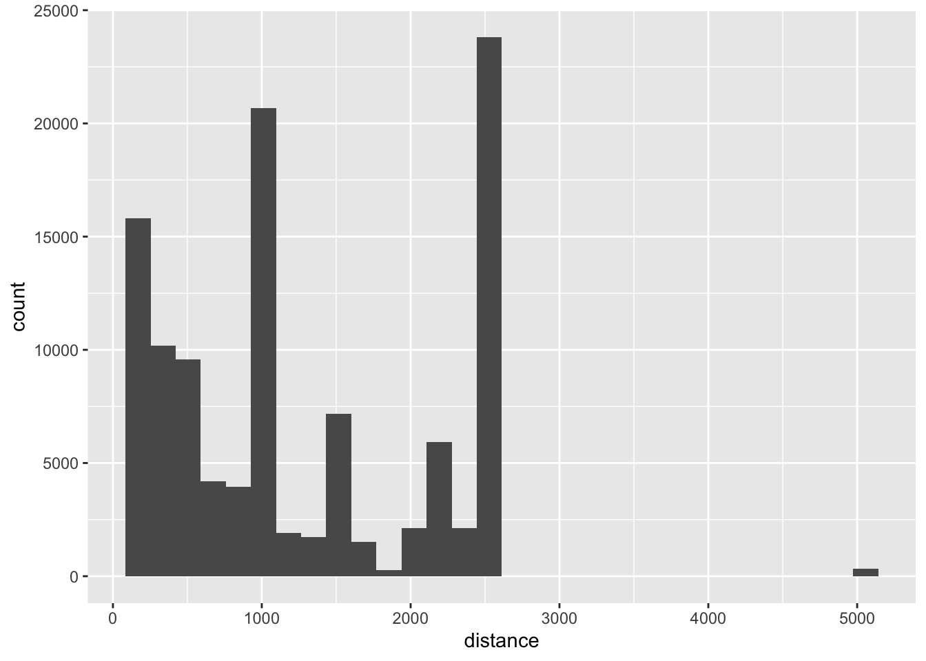 #loading packages#install.pacakges("nycflights13")library(nycflights13)library(tidyverse)dta <- flights # let's assign the flights package to an object named dta so it can show in the environment# We are now only going to look at flights from JFK. ori_jfk <- dta %>%filter(origin =="JFK")## histogram ggplot(ori_jfk, aes(x = distance)) +geom_histogram()
