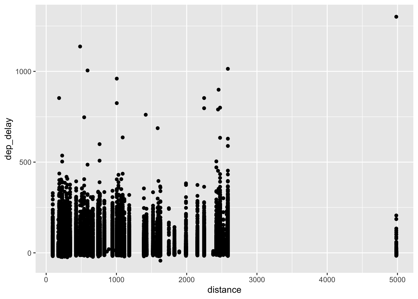 ## scatter plot ggplot(ori_jfk, aes(x=distance, y = dep_delay)) +geom_point() # Note that both X and Y are continuous
