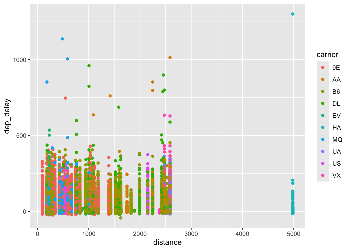ggplot(ori_jfk, aes(x=distance, y = dep_delay, color = carrier)) +geom_point() # You can color them by carrier