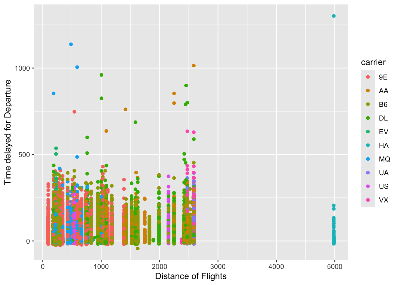 ggplot(ori_jfk, aes(x=distance, y = dep_delay, color = carrier)) +geom_point() +labs(x="Distance of Flights", y ="Time delayed for Departure",titlte ="Departure Delays and Distance") # Giving it a label