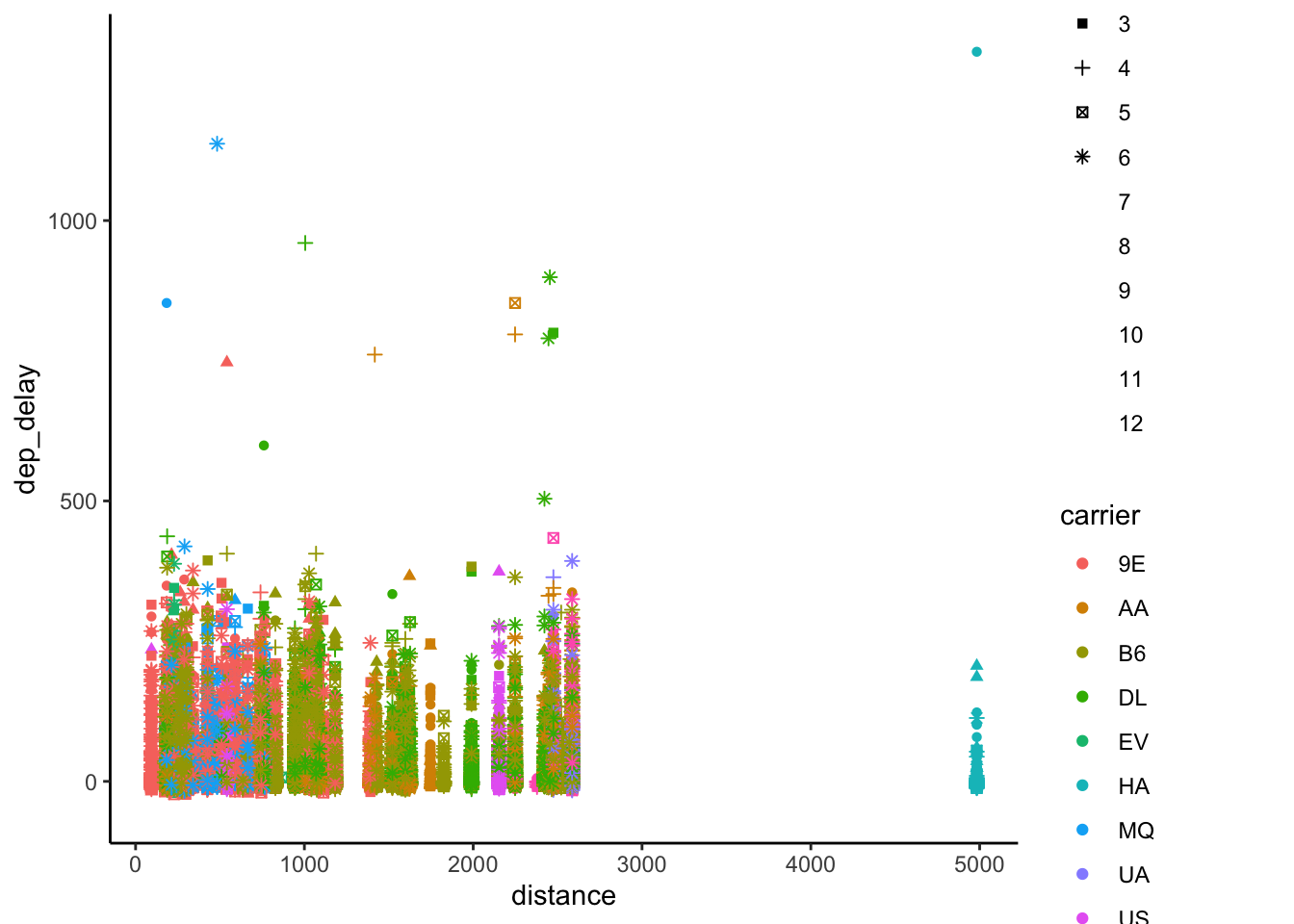 ggplot(ori_jfk, aes(x=distance, y = dep_delay, color = carrier, shape =as.factor(month))) +geom_point() +theme_classic() # You can also change shapes of dots too!