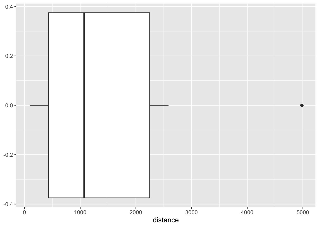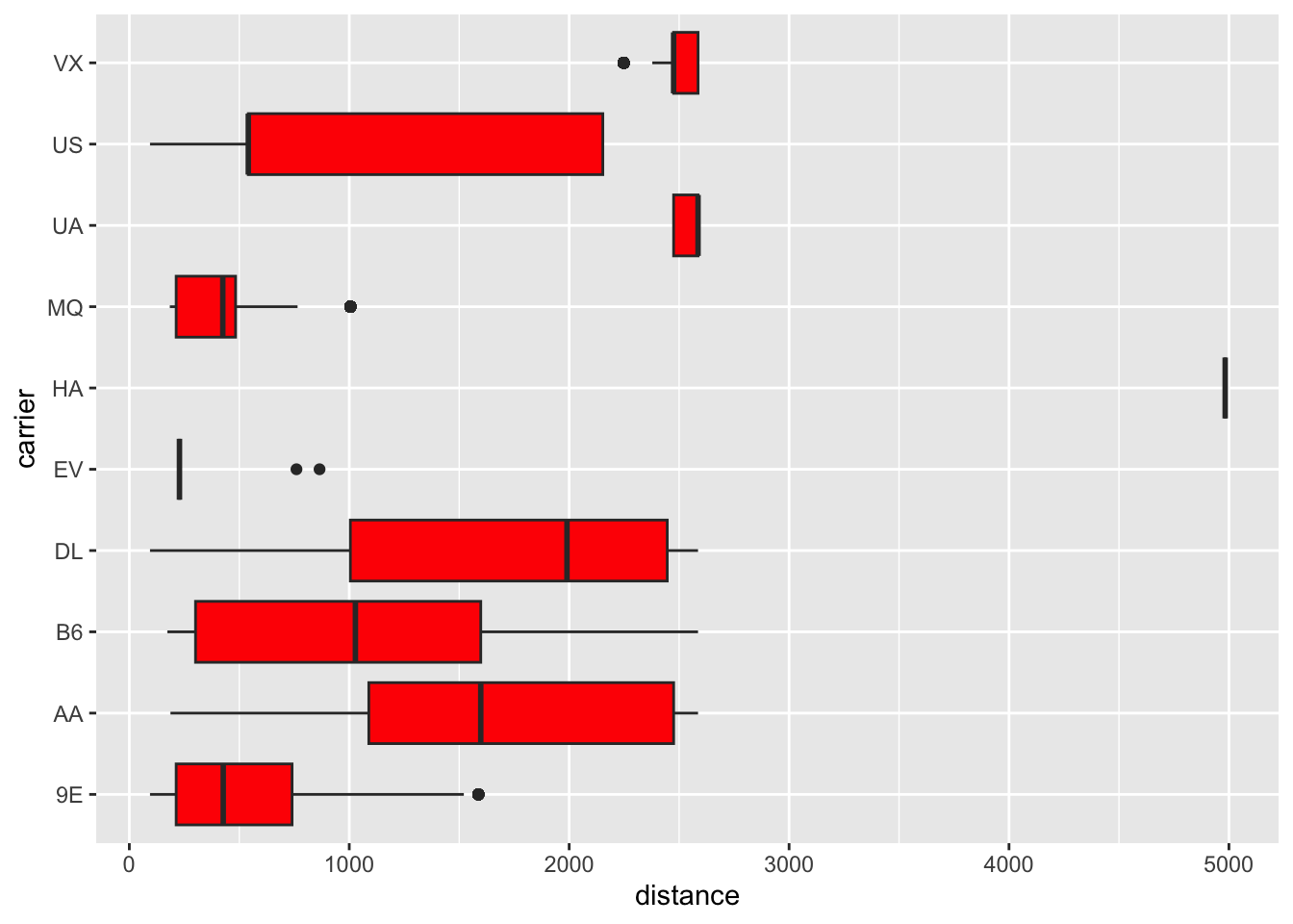 ggplot(ori_jfk, aes(x= carrier, y = distance)) +geom_boxplot(fill="red") +# Give it some colorcoord_flip() # This flips x and y axis