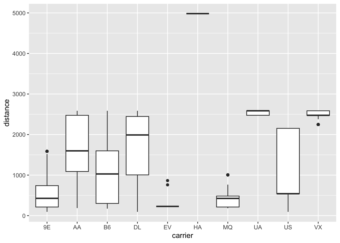 ## boxplot - bivariateggplot(ori_jfk, aes(x= carrier, y = distance)) +geom_boxplot()