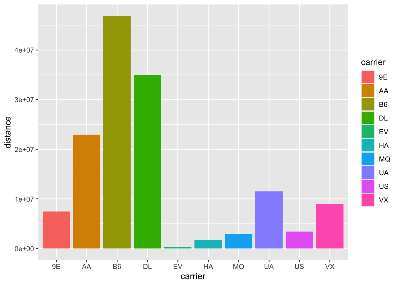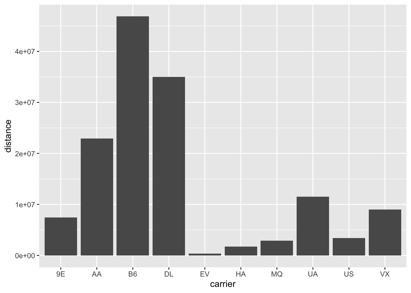 ## bar graph ggplot(ori_jfk, aes(x= carrier, y = distance)) +geom_col() # Note that X is categorical