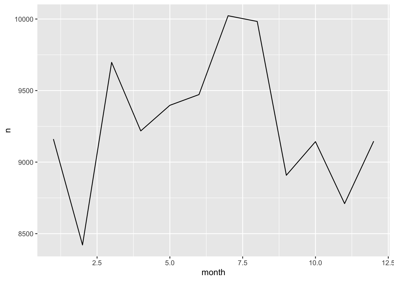 ## line graph ## Recall that line graph shows trend over timedta1 <- ori_jfk %>%group_by(month) %>%tally() # a little of data wranglingggplot(dta1, aes(x=month, y = n)) +geom_line()