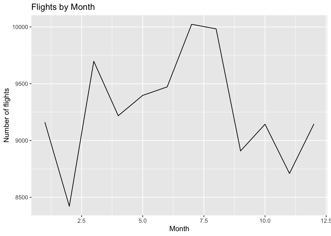 ggplot(dta1, aes(x=month, y = n)) +geom_line() +labs(x ="Month", y ="Number of flights", title ="Flights by Month") # Labeling is an important part of making graphs!