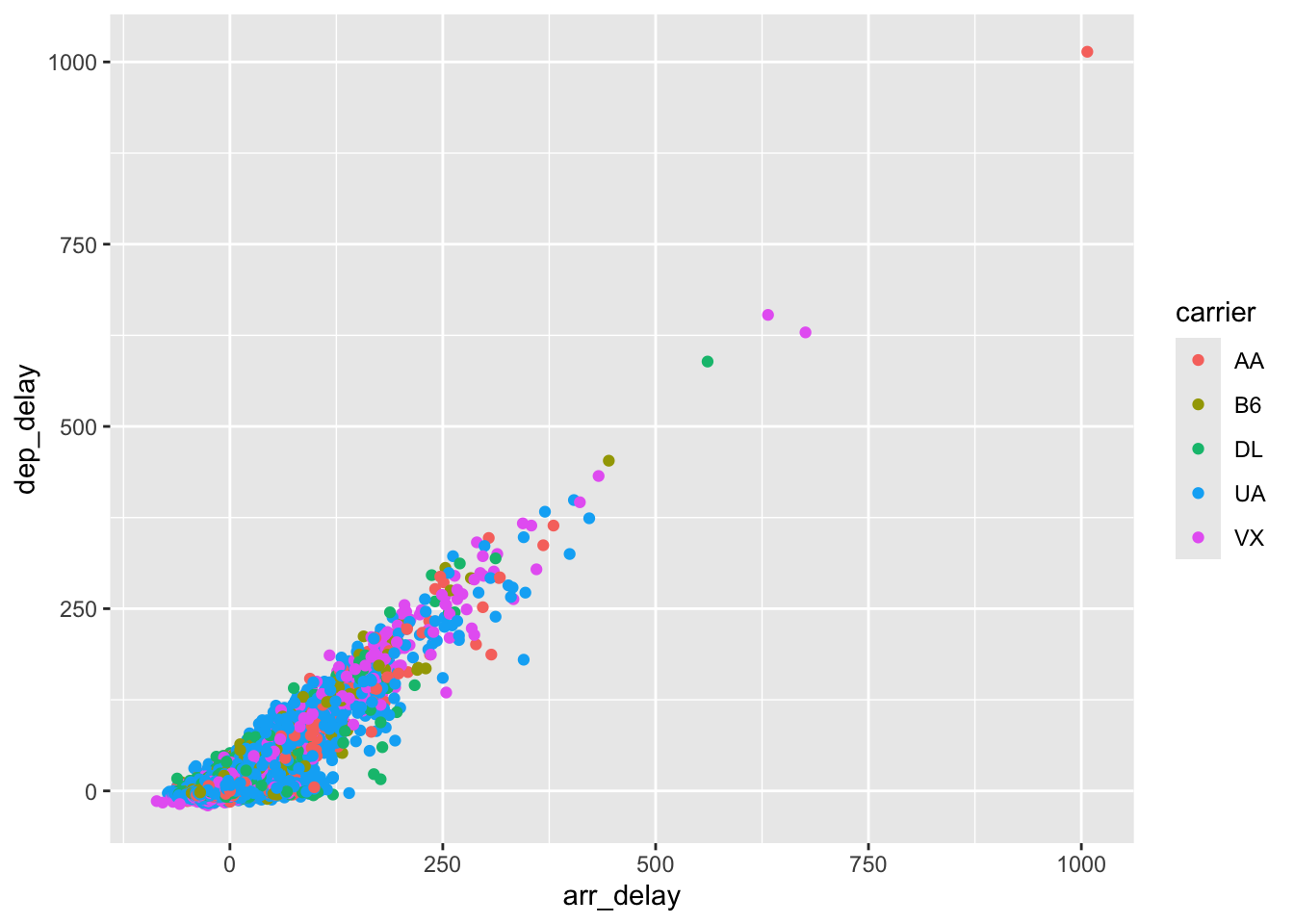 ggplot(dest_SFO, aes(x= arr_delay, y = dep_delay, color= carrier)) +geom_point()
